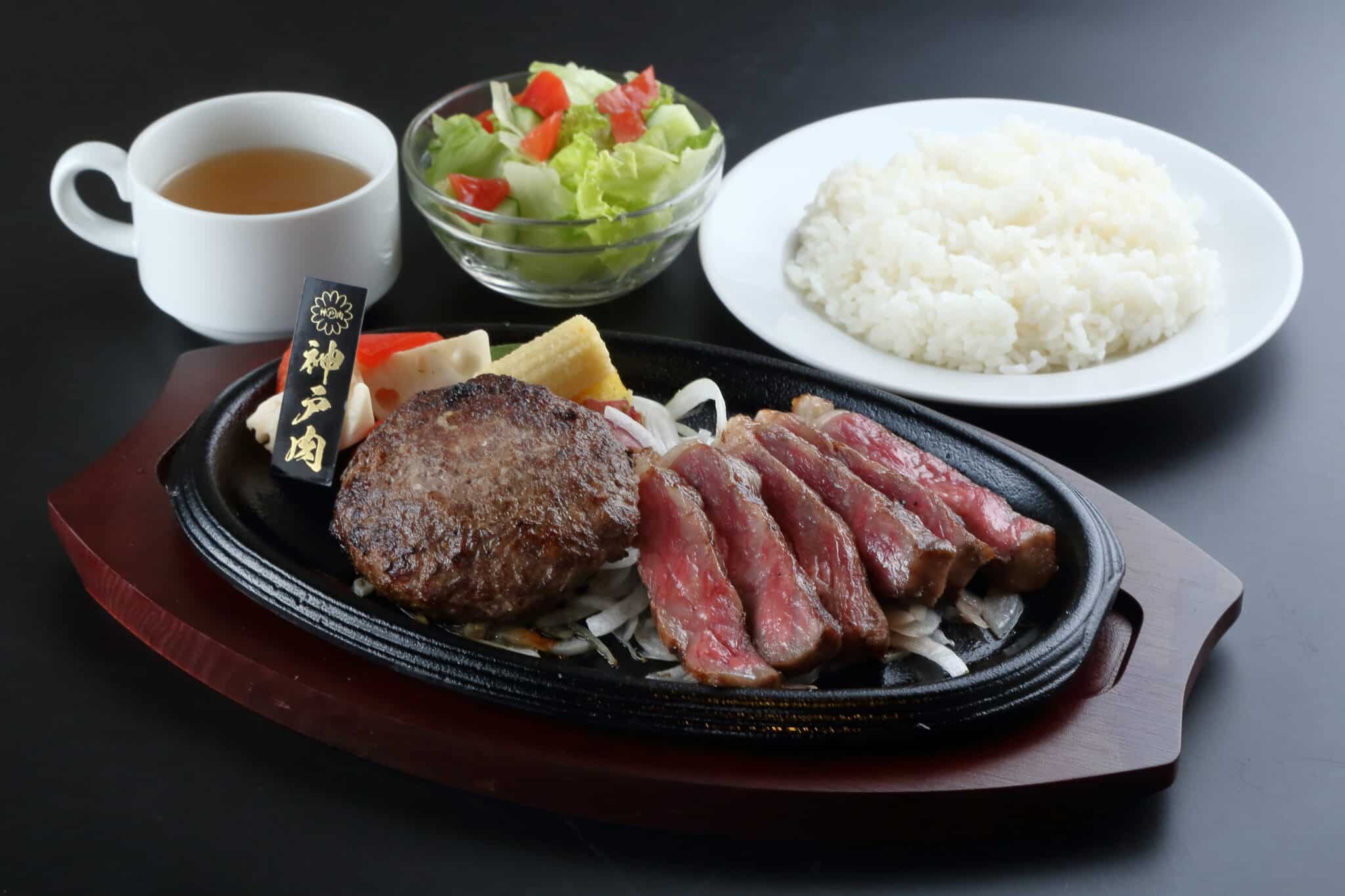 神户牛肉汉堡包牛排 180 克和和牛牛排 80 克 ¥5,980(含税 ¥6,578) 这款豪华套餐是深受欢迎的神户牛肉汉堡包和和牛牛排的梦幻组合,让您在一道菜中享受两种风味。